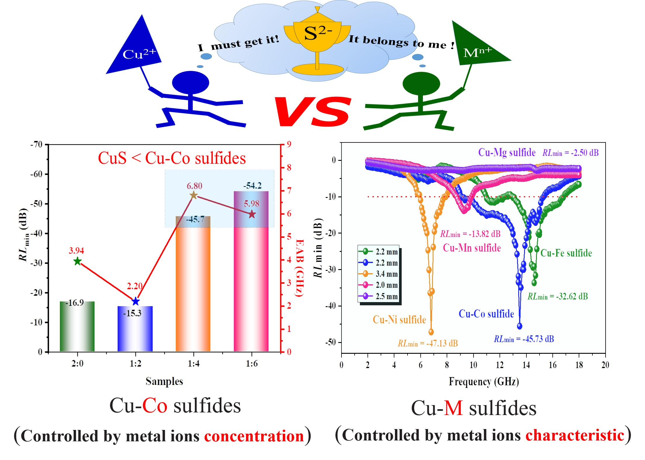 由于单组分材料很难同时满足良好的阻抗匹配和强的电磁衰减能力,因此通过复合策略构筑多组分复合材料已被证明是提高材料吸波性能的有效途径。然而传统的复合策略受限于其自身的两个缺陷:即缺乏对材料界面、组分和缺陷的精确调控,以及材料在电磁波中低频(4-12 GHz)吸收频带窄。基于上述问题,受溶解度理论启发,本项目创新性的提出了一种竞争反应策略,在低/中频微波范围内获得了高效、宽频的多组分吸波材料。以铜基二元金属(Cu-M)硫化物为研究对象,发现由于“身体素质”溶度积的差异,不同金属阳离子就像一群奋力拼搏“体育健儿”在反应体系下对于“奥运金牌”阴离子具有不同的竞争反应能力(如图2所示)。通过选择性的改变金属离子种类(Mn+= Fe3+、Co2+、Ni2+、Mn2+和Mg2+)和浓度(Cu2+: Mn+),本项目实现了对材料组分、界面和缺陷的可控调节,进而达到优化材料电磁参数和微波吸收性能的目的。这项工作突破了传统组分设计的局限性,开辟了一种崭新的方法用于制备具有宽频带吸收的多组分复合材料。值得注意的是,这种竞争反应策略简单、灵活、可控,也有望应用到除硫化物以外的其他纳米材料的设计和制备。