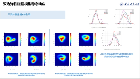 2.利用改进的GCM方法,研究了自治和非自治弹性碰撞振动系统的随机稳态响应演化。针对仅受随机激励的自治弹性碰撞系统,基于GCM理论,分析了非光滑弹性系数以及非线性系数对于系统概率密度稳定性的影响。对于在谐和激励和随机激励共同作用下的非自治弹性碰撞系统,在保留弹性碰撞过程的基础上,提出了一种将时间t作为状态变量的改进GCM方法。此外,详细研究了弹性碰撞面阻尼系数、系统非线性系数以及外激频率对系统随机P-分岔的影响。并且结合对应确定性系统的分岔图和吸引子、吸引域全局特征,发现稳态概率密度分布与对应确定性系统吸引子和内部混沌鞍的分布具有一定关联性。