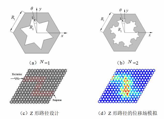 2:结合科赫雪花和六边形板晶格设计了科赫雪花板晶格超材料,得到了弹性波在科赫雪花板晶格超材料中的传播规律,实现了弹性波导设计。