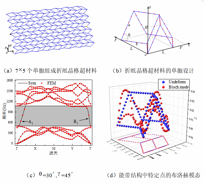 4:设计了基于三浦折纸的晶格超材料,采用辛算法建立了晶格超材料的动力学方程的简化求解方法,得到了结构参数对波传播特性的影响规律。