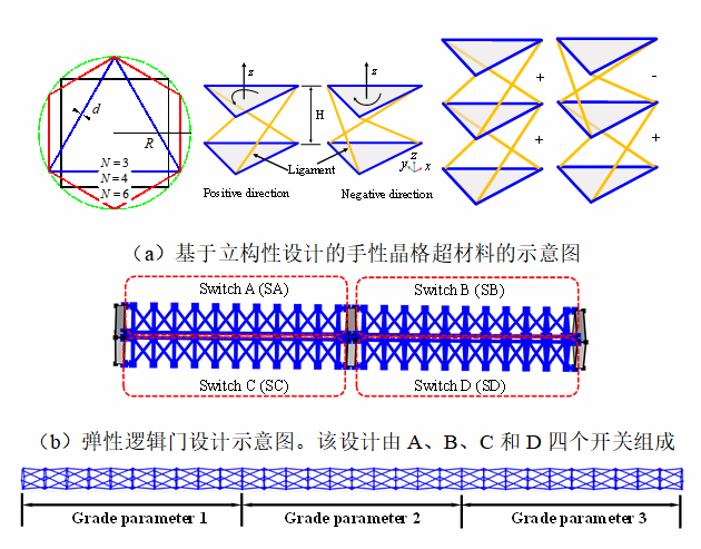 3:研究了具有不同立构性的手性晶格超材料的波传播特性,提出手性晶格超材料的立构性设计方法,实现了弹性波逻辑门设计、梯度设计以及数字编码设计。
