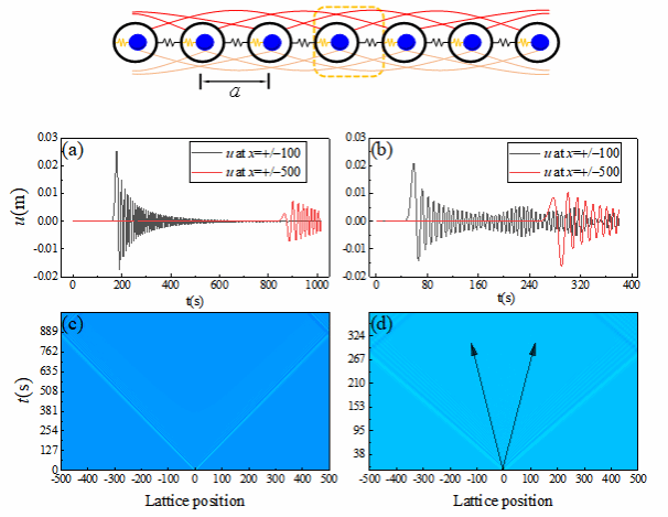 1:研究了具有长程相互作用的一维局部谐振超材料的动力学特性,得到了长程相互作用对动力学特性的影响规律。
