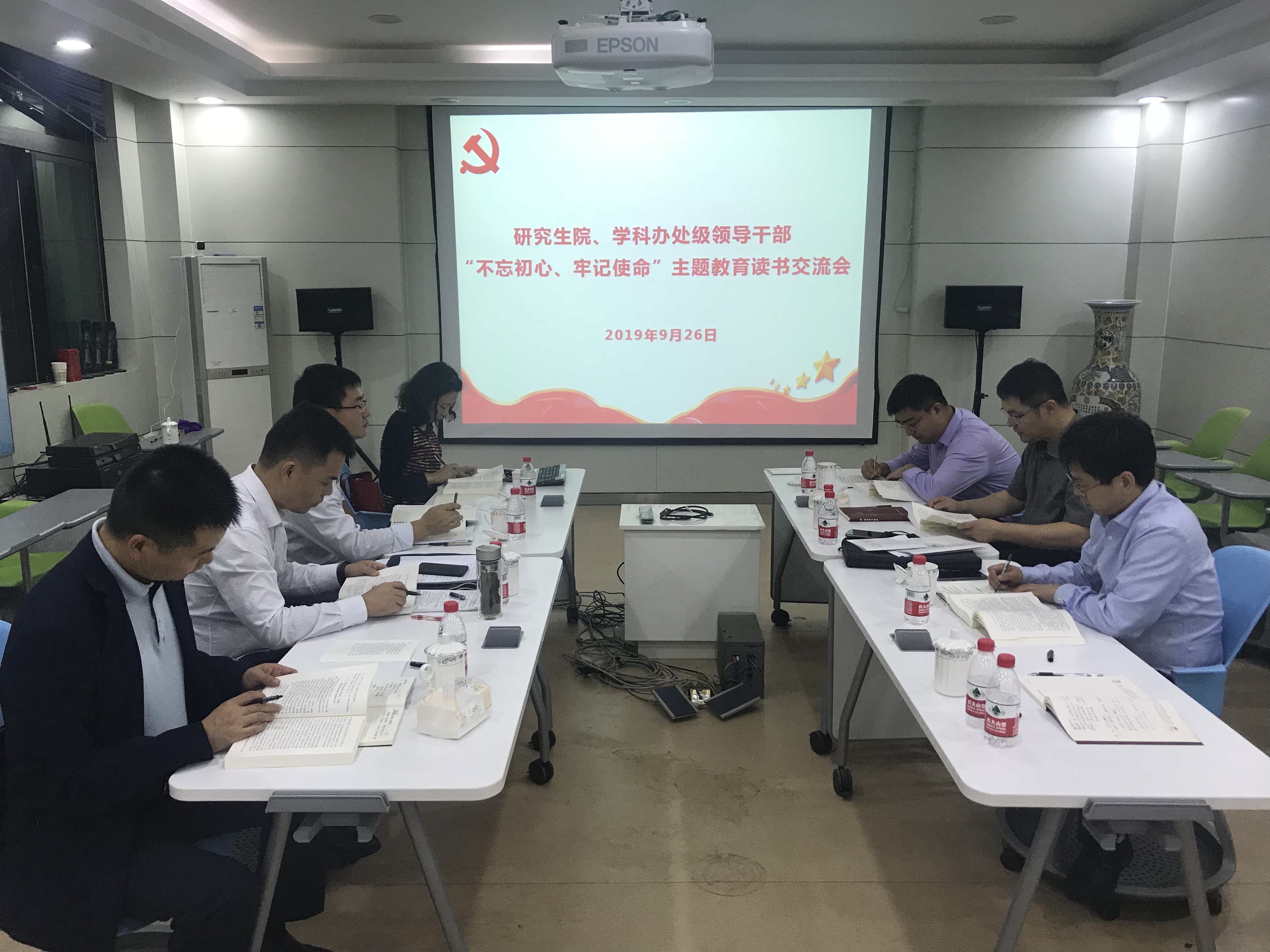 研究生院、学科办高度重视“不忘初心、牢记使命”主题教育,按照主题教育方案要求,每周四晚为领导班子固定学习时间,由每位院领导领读学习相应书籍。通过集中学习研讨,切实把学习教育贯穿主题教育的全过程,抓住关键,突出重点,确保学习取得实实在在的成效,做到“知信行”合一、学以致用,进一步推动工作高质量、高水平发展!